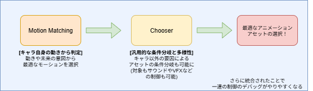 Motion Maching が Chooserノードに統合された意味としては、Motion Matching が選んだ「候補のポーズ・アニメーション」に対して、さらに Chooser の条件分岐をかけられる、という二段構えの構成により、さらにモーション制御が柔軟に制御できるようになった、ということとなります。